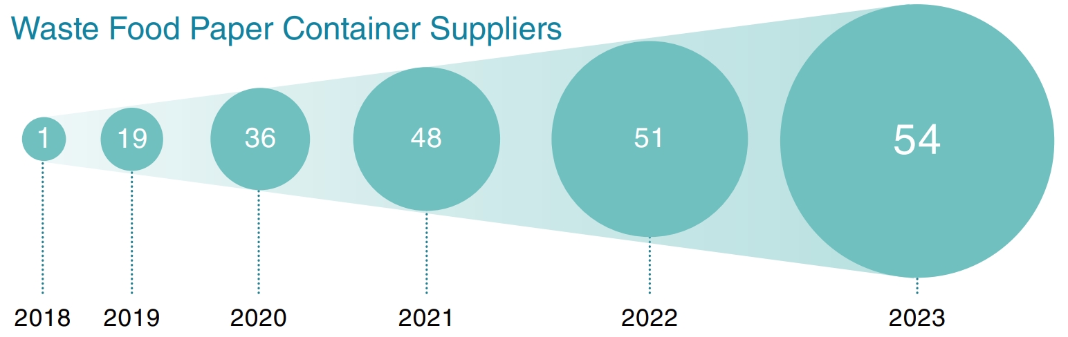 CLC recycled domestic recovered paper with the largest scale in Taiwan. However, recovered paper in Taiwan usually mixes with 10~13% household waste due to improper recycling practices, affecting recycling effects and increasing the energy consumption. Since 2018, CLC has guided 167 recycling companies, we enhance the local recovered paper quality in line with the international standard and the competitiveness of supply chain from the sound source recycling system. In addition, the amount of waste food paper container suppliers which increase to a total of 54 form the local purchase and recovery supply chain ecosystem.