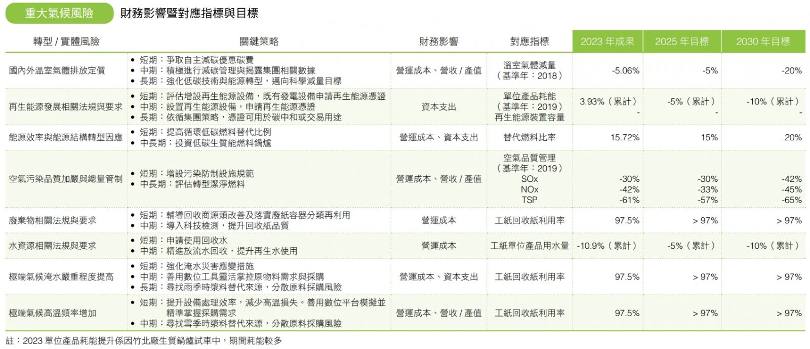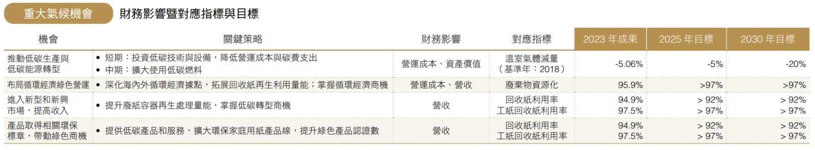 訂定氣候相關績效指標與量化目標,定期追蹤達成度,並對外透明揭露