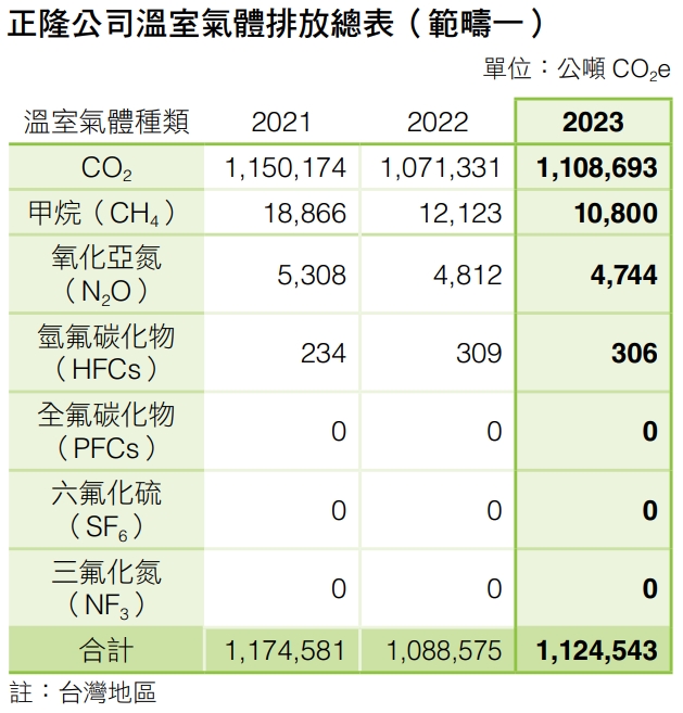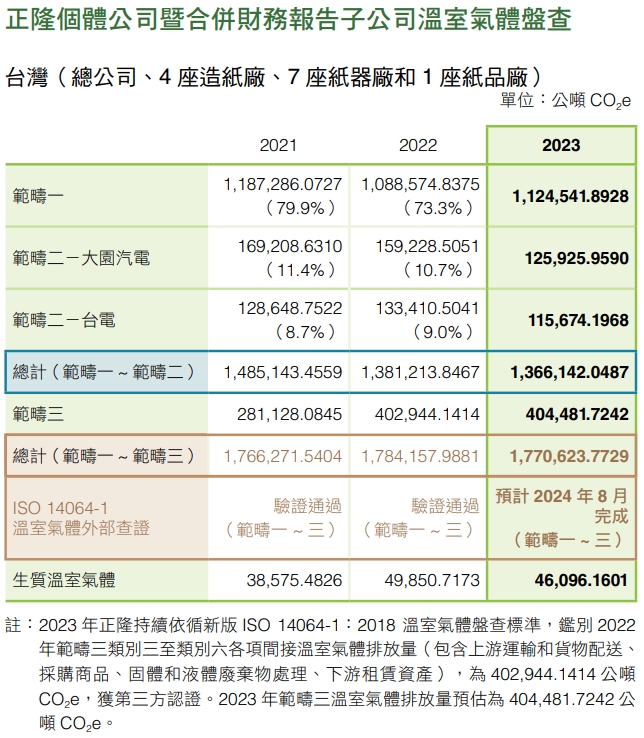 接軌國家淨零排放目標,正隆以邁向「2030年減碳20%、2050年碳中和」之中長期目標,並務實提出四大科學減碳路徑:能源效率提升、再生能源發展、深化循環經濟低碳燃料、創新應用負碳技術,積極回應全球減碳趨勢與企業綠能轉型目標。2023年正隆台灣 地區溫室氣體排放量為 1,366,142.0487公噸CO2e(範疇一及範疇二),較2022年減少15,071.7980公噸CO2e,並較2018年基準年減少5.06%。本公司 2023年溫室氣體盤查係依據 ISO 14064-1: 2018標準要求, 並由第三方查證單位依據ISO 14064-3:2006驗證標準查證,預計2024年8月底前完成,完整確信資訊將於2024年12月前上傳正隆官網 - 下載中心揭露。