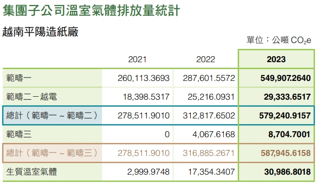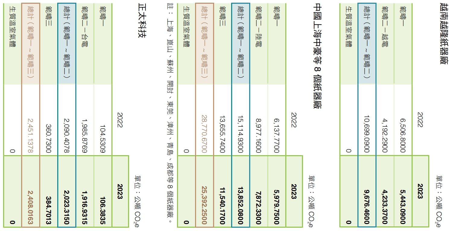 海外部分,2023年越南平陽造紙廠溫室氣體排放量為579,240.9157公噸CO2e,其範疇一及範疇二之排放量分別為549,907.2640公噸CO2e 及29,333.6517公噸 CO2e。2023年越南越隆紙器廠溫室氣體排放量為9,676.4600公噸CO2e,範疇一及範疇二之排放 量分別為5,443.0900公噸CO2e及4,233.3700公噸 CO2e;中國上海中豪等8個紙器廠其範疇一及範疇二 之排放量分別為5,979.7500公噸CO2e及7,872.3300公噸CO2e,合計13,852.0800公噸CO2e;正太科技範疇一及範疇二之排放量分別為106.3835公噸CO2e及1,916.9315公噸CO2e,溫室氣體排放量合計2,023.3150公噸CO2e。