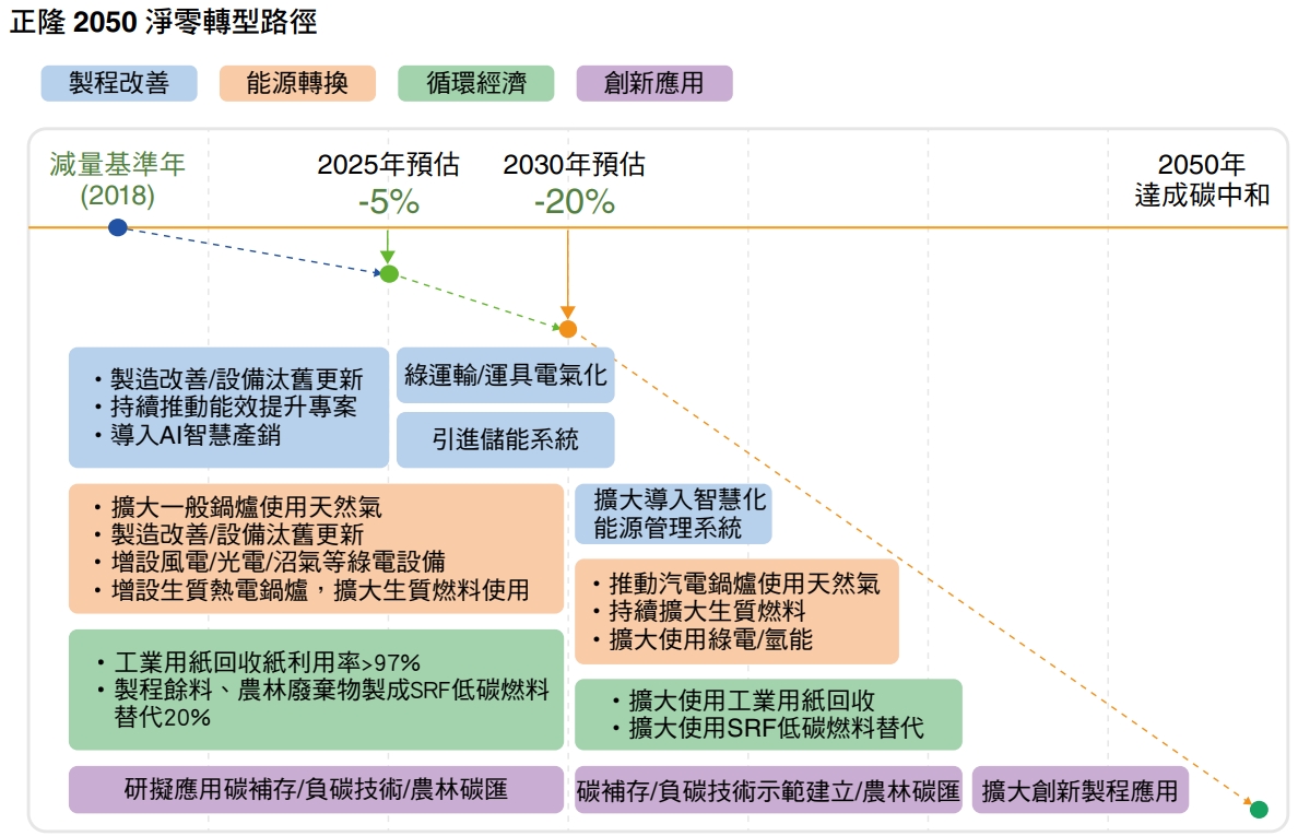 為加速集團實踐淨零轉型,正隆訂定四大科學減碳路徑:提高能源效率、發展再生能源、深化循環低碳燃料、 創新應用負碳技術,並攜手國立中興大學成立亞洲首 座「循環經濟研究學院」,積極投入農林剩餘資材循環再利用,首創3R PLUS資源全循環減碳製造鏈,布局循環低碳生質料源生態系。2023年第一季也與國立 中央大學推動大園碳封存先行示範場域之潛能評估與未來商模研究,建立全國第一個CCS二氧化碳捕獲、 再利用與地質封存(Carbon Capture, Utilization and Storage, CCUS)典範,穩健邁向2050年碳中和目標。