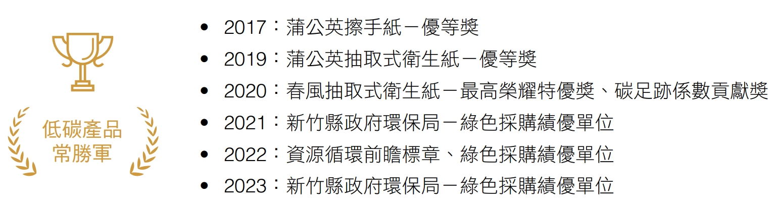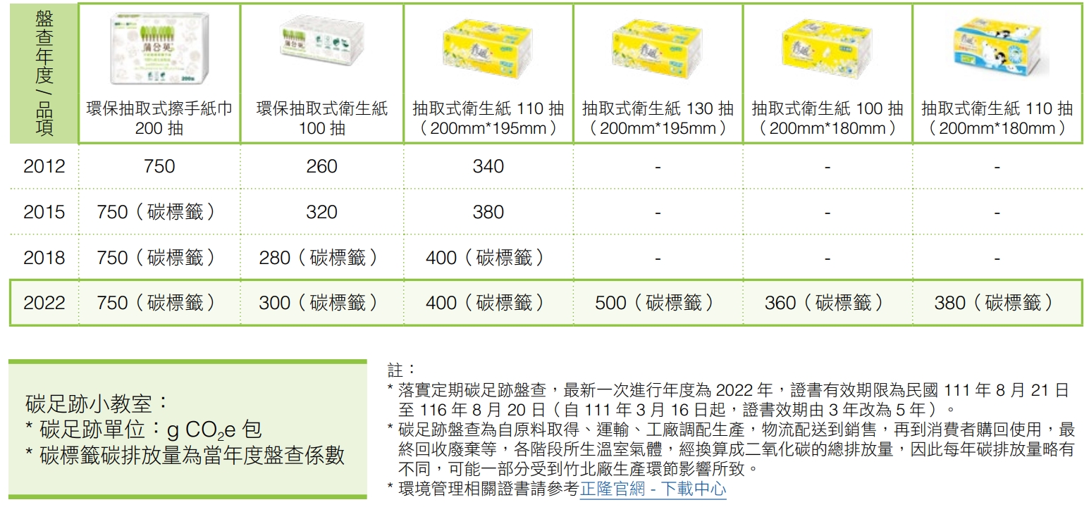 正隆有超過9成商品使用再生原料,包含:回收紙/紙容器、下腳料製造等,剩下1成則採用可維護生物多樣性的FSC™木漿,多項商品榮獲環境部低碳產品獎。積極以科學方法驗證減碳成效,正隆針對大宗產品進行例行性碳管理,2023年共有6項家庭用紙產品取得碳足跡標籤,2025年規劃增加3個品項取得碳足跡,持續進行減碳管理;同時,亦呼應國家淨零轉型12項關鍵戰略之「淨零綠生活」,提供標示碳足跡之產品,供消費者選用,幫助社會脫碳。