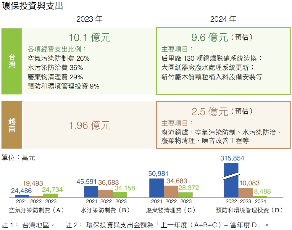 遵循海內外法規趨勢,正隆明確歸納環保支出與投資,並於2001年導入環境會計制度,2023年海內外投入金額達12.06億元,未來也將持續投入經費提升環境績效。