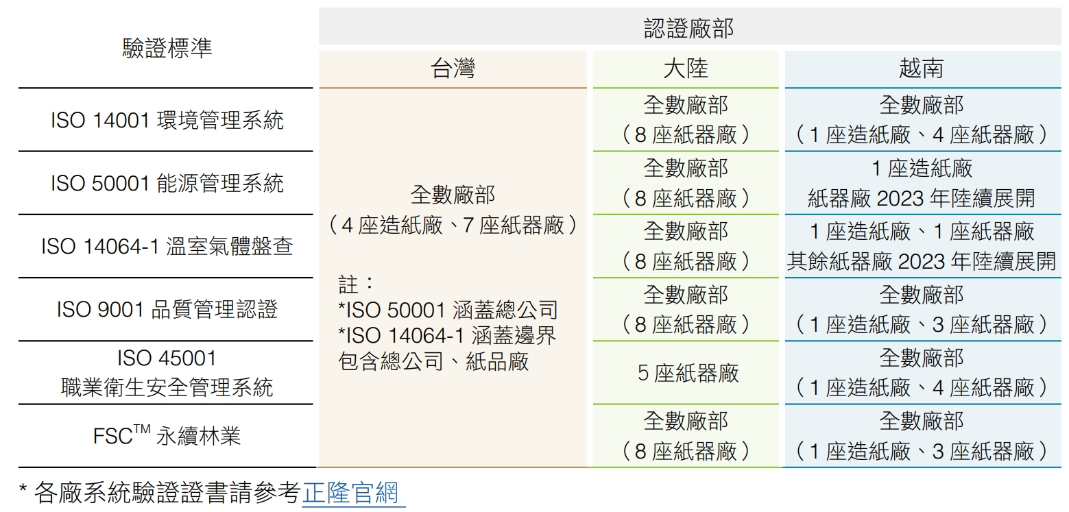 正隆以綠色紙業自許,為迎合綠色產品和消費趨勢,更運用清潔生產技術製造成再生紙,符合環境效益及資源永續利用之精神。全公司除持續落實執行FSCTM國際森林 管理系統標準,全台各廠皆導入國際管理系統,包含ISO 14001環境管理系統、ISO 14064-1溫室氣體盤查、ISO 50001能源管理系統等國際標準認證。承襲台灣成功經驗, 海外中國大陸和越南所有營運據點皆已導入ISO 14001環境管理系統;集團海內外子公司亦於2022年啟動組織溫室氣體盤查和能源管理系統,其中越南平陽造紙廠、越隆紙器廠及中國上海中豪等8個紙器廠已取得ISO 14064-1認證與ISO 50001認證。