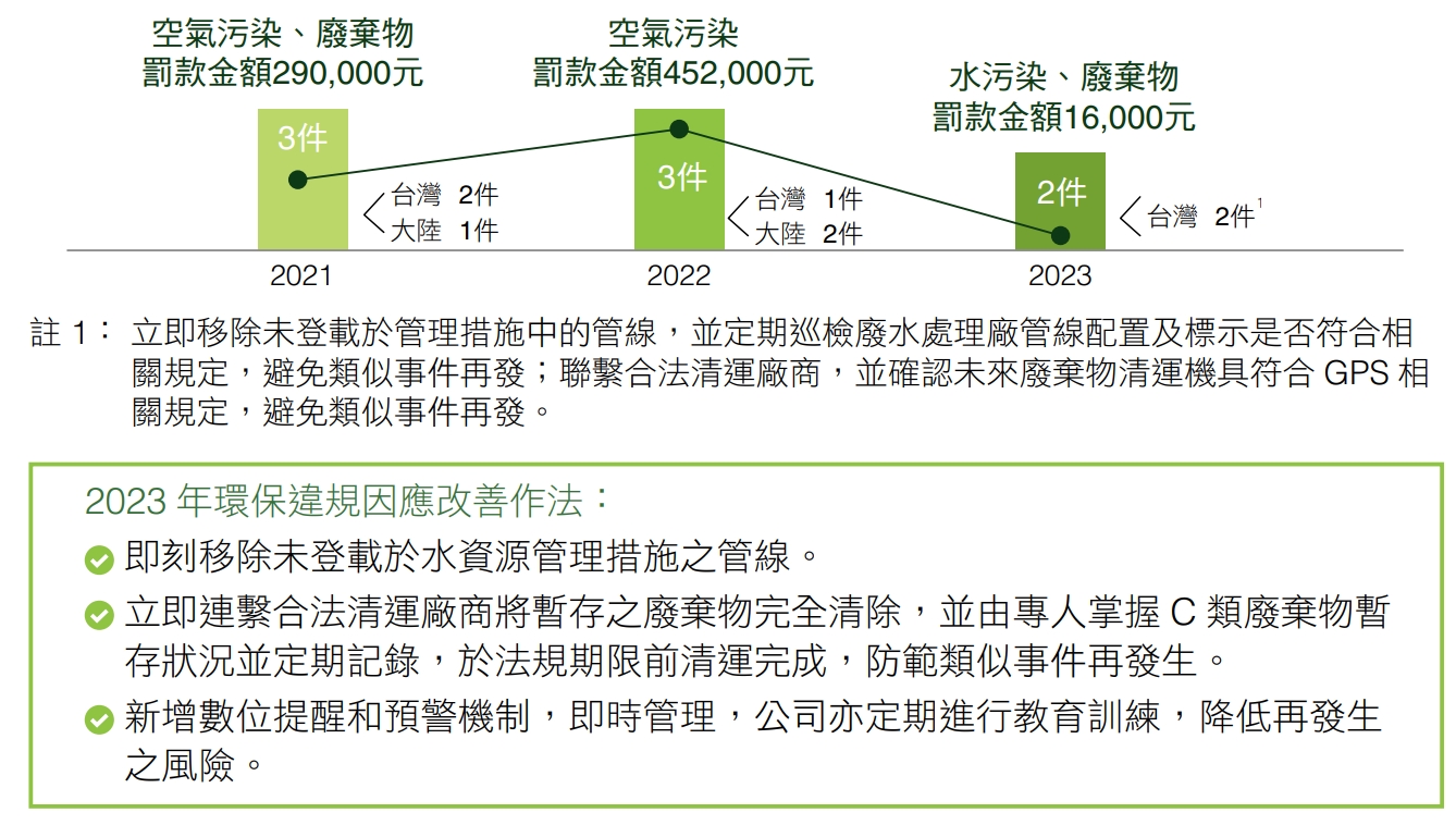 秉持社會責任與永續發展精神,正隆以零重大違規為目標,持續投資空、水、廢及異味汙染物處理等先進環保設備,且積極導入各項管理機制,謹守企業營運相關規範。近年 環保相關罰單金額和件數已逐年減少。2023年並未發生重大罰款紀錄,海內外環保相關法規缺失共計2件,水污、廢棄物各為1件,針對缺失本公司已積極改善,且預防再發生,並持續透過數位工具、教育訓練、精進SOP和研發投資,審慎管理。
