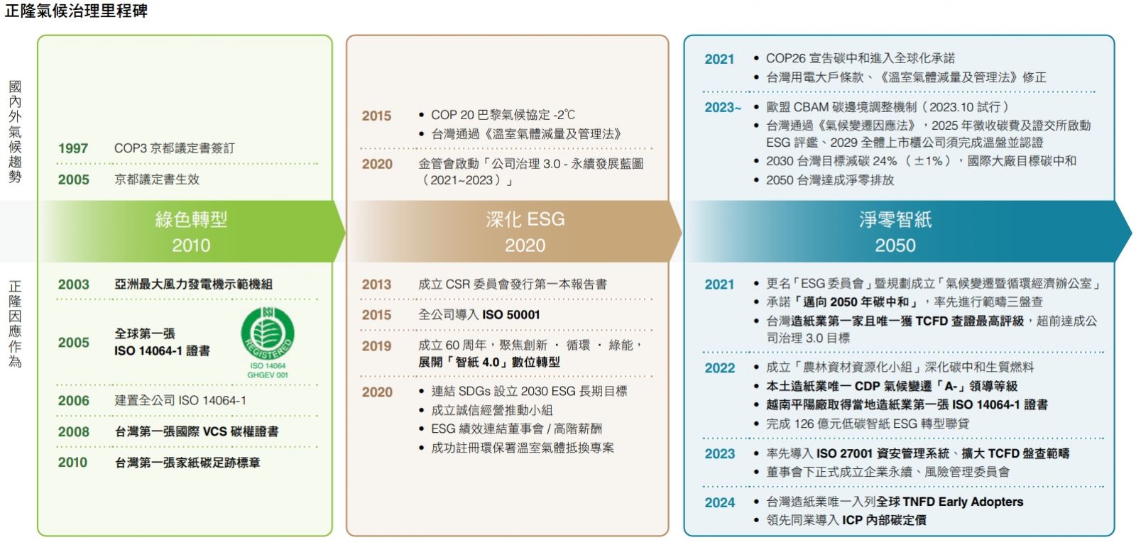 前瞻國際氣候變遷與碳管理趨勢,正隆自 2005 年取得 全球第一張 ISO 14064-1 溫室氣體盤查證書起,即啟 動生產線的減排管理,領先推動低碳轉型,並於 2008 年取得台灣第一張碳權交易證書、2010 年取得台灣首 個家紙產品碳足跡標籤、2023 年更議合產業鏈組成減 碳國家隊,同時完成台灣首例工業用紙產品碳足跡盤 查,加速掌握零碳轉型商機。