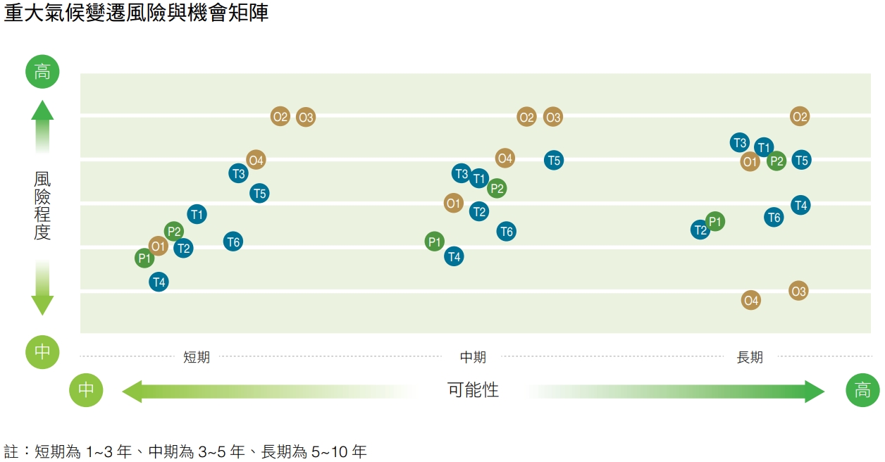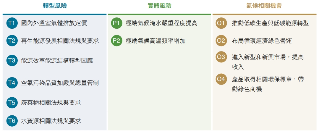 正隆於董事會下增設企業永續、風險管理兩大功能性委員會,以利董事會監管氣候治理、策略與目標等重大管理議題。鑒於氣候變遷風險日趨嚴重且頻繁,本 公司於企業永續委員會下設立「氣候變遷暨循環經濟 辦公室」,由總經理擔任召集人,以靈活整合跨部門 工作小組,推動集團 TCFD、TNFD、內部碳定價等氣 候治理專案執行。及早因應歐美先進國家推動氣候法、 碳關稅等制度,以及台灣即將開徵碳費,本公司2023年啟動TCFD重估計畫,擴大鑑別範疇至台灣地區所有營業據點,以充分掌握短中長期氣候變化所帶來的 風險和機會及財務量化數據影響,最終辨識出6項重大轉型風險、2項實體風險與4項氣候相關機會,以及相關財務衝擊,本公司將會持續採行各項措施以強化風險管理與營運韌性,加速布局低碳發展與氣候調適策略,並掌握氣候低碳商機。
