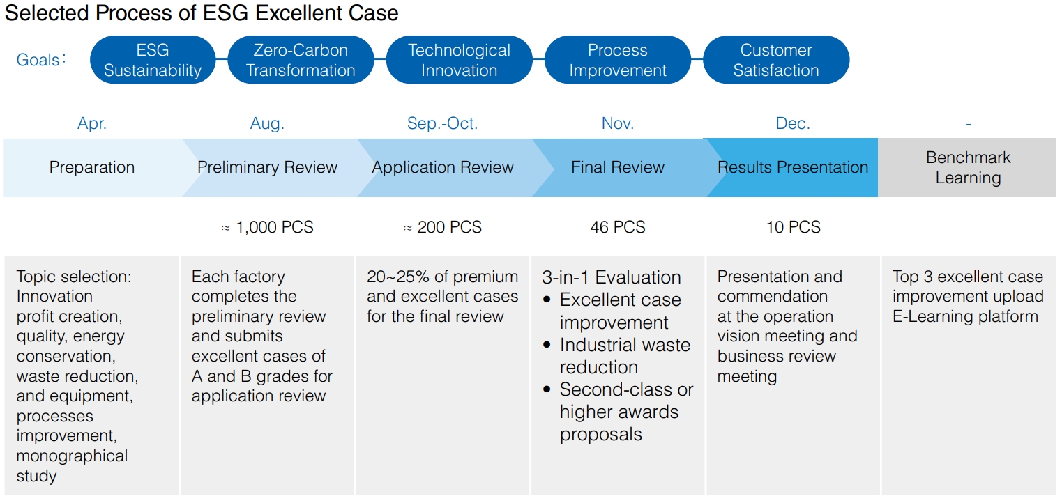 Since 1980, CLC has introduced proposal improvement systems, QCC, and TPM. In 2008, we launched an activity integrating evaluation and rewards, focusing on process enhancement, technology development, green energy innovation, and customer service. This initiative channels carbon reduction suggestions from frontline manufacturing to senior management. Recently, in response to ESG transformation, CLC has used competitions to motivate employees to identify issues, fostering healthy competition and enhancing problem-solving and innovation. Since 2021, ESG improvement activities have extended to overseas locations, encouraging continuous innovation and optimization.